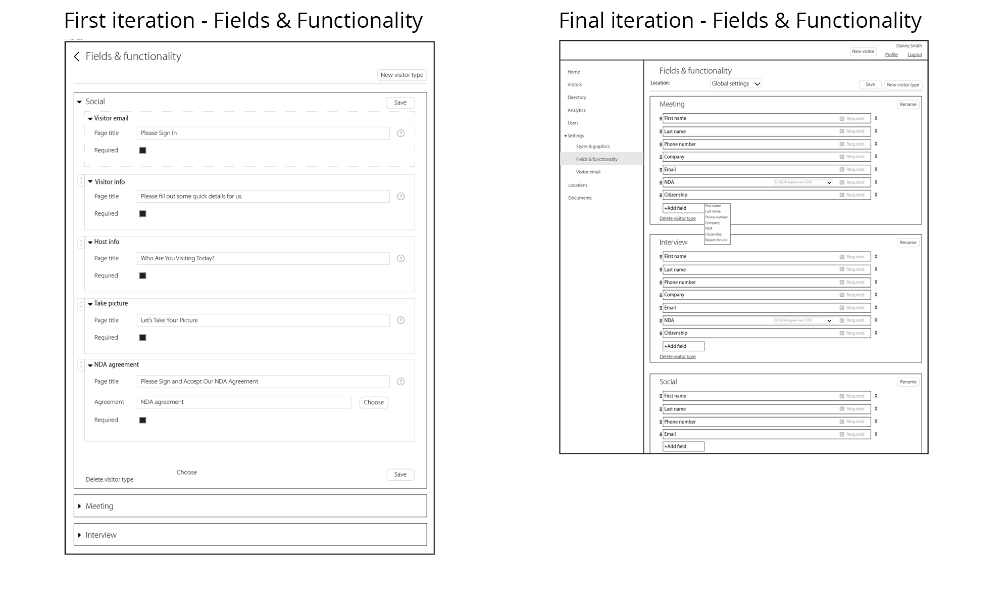 The original purpose of this ‘Fields & Functionality” page was to give users form field text customization and if that step would be required for sign in or not. Throughout the design process, we decided that field names would be static and users would only be able to rearrange and toggle fields. The rationale for this is that we do not anticipate users to change form text.